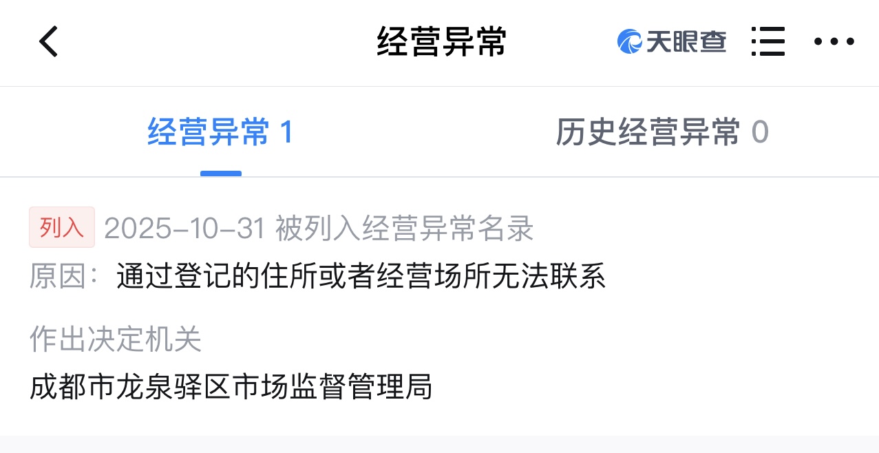 据天眼查APP显示盈鑫惠,10月31日,四川野马汽车股份有限公司由于通过登记的住所或者经营场所无法联系,被成都市龙泉驿市场监督管理局列入经营异常名录。