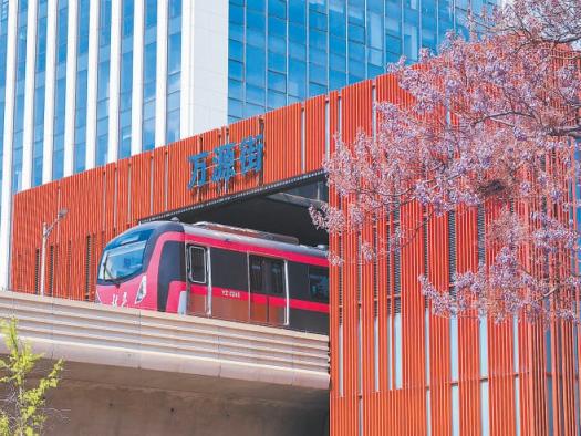 地铁万源街站,亦庄线地上段在繁花掩映间穿梭而过。 邓伟摄
